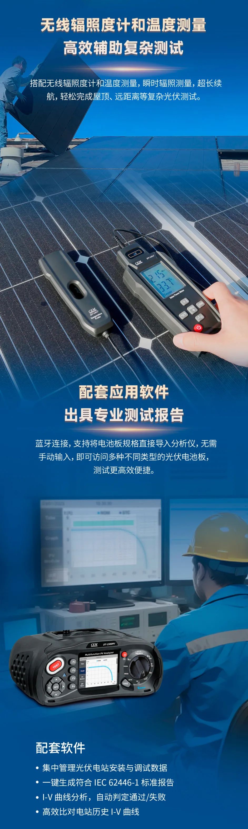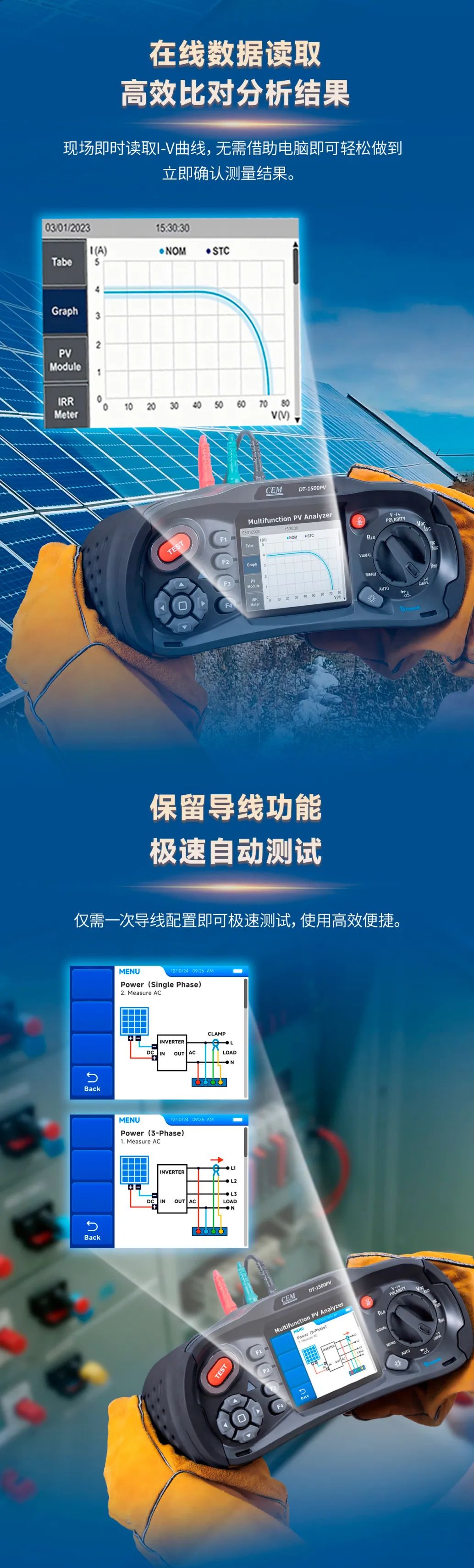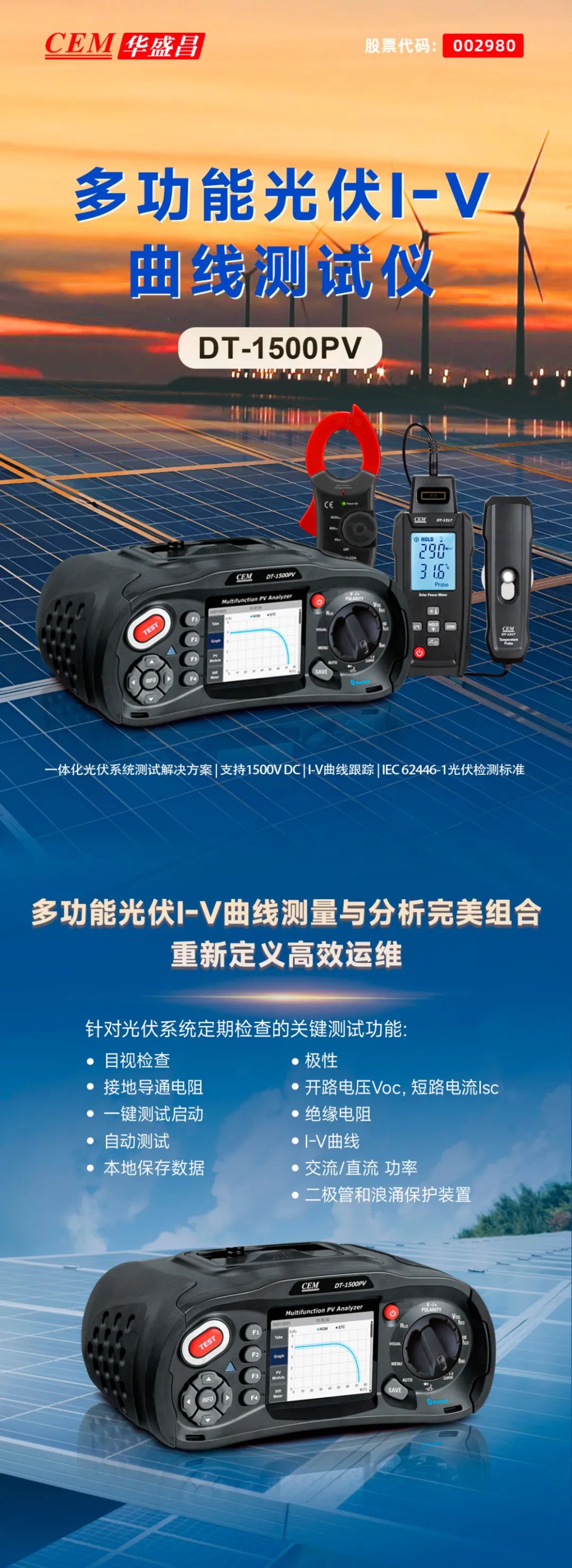华盛昌(002980)DT-1500PV多功能光伏I-V曲线测试仪集成高清彩屏实时显示I-V曲线,支持在线数据直读,现场即时比对结果,支持一次接线连续测试,搭配无线辐照度计及温度测量盈珑操盘,超长续航适应复杂场景,可通过WiFi/蓝牙预置多组件参数,配套软件一键生成IEC 62446-1标准报告,覆盖电站验收、运维诊断、定期巡检、设备抽检、微电网调试及科研培训等多场景测试需求。